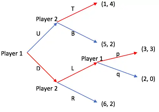 - Subgame for actions p and q: Player 1 will take action p with payoff (3, 3) to maximize Player 1's payoff, so the payoff for action L becomes (3,3).