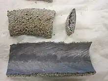 Pieces of slag from Submerged arc welding exhibiting glassy surface due to silica (SiO2).