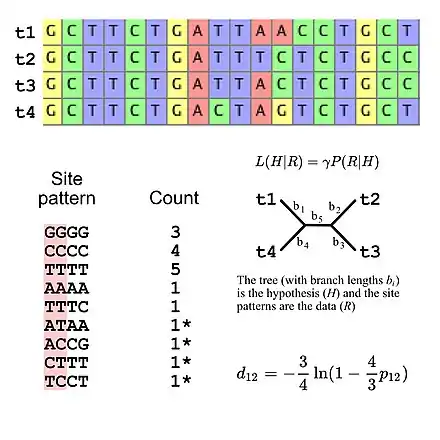 Multiple sequence alignment (in this case DNA sequences) and illustrations of the use of substitution models to make evolutionary inferences. The data in this alignment (in this case a toy example with 18 sites) is converted to a set of site patterns. The site patterns are shown along with the number of times they occur in alignment. These site patterns are used to calculate the likelihood given the substitution model and a phylogenetic tree (in this case an unrooted four-taxon tree). It is also necessary to assume a substitution model to estimate evolutionary distances for pairs of sequences (distances are the number of substitutions that have occurred since sequences had a common ancestor). The evolutionary distance equation (d12) is based on the simple model proposed by Jukes and Cantor in 1969. The equation transforms the proportion of nucleotide differences between taxa 1 and 2 (p12 = 4/18; the four site patterns that differ between taxa 1 and 2 are indicated with asterisks) into an evolutionary distance (in this case d12=0.2635 substitutions per site).