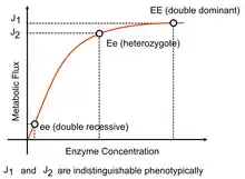 Moreover, Kacser and Burns[13] suggested that since the flux–enzyme relationship is somewhat hyperbolic, and that for most enzymes, the wild-type diploid level of enzyme activity occurs where the curve is reaching a point in the curve where changes have little effect, then since a heterozygote of the wild-type with a null mutant will have half the enzyme activity it will not exhibit a noticeably reduced flux. Therefore, the wild type appears dominant and the mutant recessive because of the system characteristics of a metabolic pathway. Although originally suggested by Sewall Wright,[14][15] the development of metabolic control analysis put the idea on a more sound theoretical footing. The flux summation theorem in particular is consistent with the flux summation theorem for large systems. Not all dominance properties can be explained in this way but it does offers an explanation for dominance at least at the metabolic level.[16]