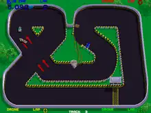 Up to three players drive simultaneously on a circuit against opponents controlled by the computer. The circuits are viewed from above and always fit on the screen, so the game never scrolls. After three laps the winner advances to the next circuit. There are eight circuits in total, but the game only ends if gamers can get to race 85 where the bonus Super Speedway circuit is played. As the player goes to higher levels, more and more obstacles appear on the track, like oil puddles and tiny moving tornadoes. If the car touches them, the player loses control over the car for a short time while it is sliding and spinning. Driving into a wall with high speed or falling from one of the bridges destroys the car, but a helicopter will appear to replace it.