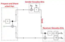 - ↑ Bennett, C.; Wiesner, S. (1992). "Communication via one- and two-particle operators on Einstein-Podolsky-Rosen states". Physical Review Letters. 69 (20): 2881–2884. Bibcode:1992PhRvL..69.2881B. doi:10.1103/PhysRevLett.69.2881. PMID 10046665.