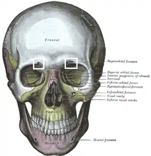 ![]() The skull from the front. ("Supraorbital foramen" is top caption for right side white-box.) | |