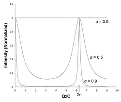 In the case of perfect absorption, , and the intensity becomes independent of , with a maximum for any (the component of parallel to the crystal surface) that satisfies the 2D Laue condition in reciprocal space