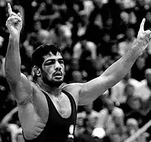 Sushil Kumar (born 26 May 1983)[1] is a former Indian wrestler.[8] He carried the Indian flag at the opening ceremony of 2012 London Olympics. His 2008 Olympic medal was the second for India in wrestling, and the first since Khashaba Dadasaheb Jadhav's bronze medal at the 1952 Summer Olympics.[9][10] In July 2009, he received the Major Dhyan Chand Khel Ratna – India's highest honour for sportspersons.[11] On 3 October 2010, Kumar handed the Queen's Baton to Prince Charles in the Queen's Baton Relay for the 2010 Commonwealth Games Opening Ceremony.[12][13] Sushil won the gold medal in the 74 kg division at the 2014 Commonwealth Games.[14][8][9] Sushil won the gold medal in the 74 kg division at the 2018 Commonwealth Games. He is the first and only Indian who has won a gold medal at Wrestling.