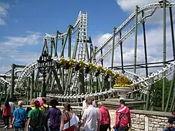 There are several different layouts of Suspended Looping Coasters although most feature a similar pattern.[2] The ride starts by taking riders up a 33.3-metre (109 ft) chain lift hill.[5] Once at the top, the train drops down a steep, banked right turn where it enters the first inversion element - a right rollover. A rollover is an Immelmann loop followed by a Dive Loop[6] After exiting this element, the train traverses a tall, banked left turn and approaches the ride's next inversion - a left sidewinder.[5] A sidewinder is similar to an Immelmann loop; however, it features a half-loop followed by a half-corkscrew (rather than an inline twist).[7] After exiting the sidewinder, the train navigates a 270o right upwards helix before entering the ride's final two inversions - a double inline twist. A banked 90o turn to the right then turns the train back around to face towards the station. At this point, some models feature an additional helix to the left, while others simply continue straight into the brake run.[5] The standard model also has a relatively compact layout, providing numerous "footchoppers".