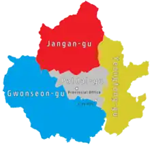 On 1 January 1963, Suwon expanded greatly as Cheoncheon-ri, Daehwanggyo-ri, Gokbanjeong-ri, Gosaek-ri, Guun-ri, Gwonseon-ri, Hagwanggyo-ri, Imok-ri, Jangji-ri, Jeongja-ri, Jowon-ri, Maetan-ri, Omokcheon-ri, Pajang-ri, Pyeong-ri, Sanggwanggyo-ri, Songjuk-ri, Tap-ri, Woncheon-ri, and Yuljeon-ri were incorporated from Hwaseong-gun.[41] On 15 February 1983, further expansion saw Ha-ri and Iui-ri switch from Yongin to Suwon.[42] On 1 January 1987, Suwon expanded westwards as Geumgok-ri and Homaesil-ri were acquired from Maesong-myeon in Hwaseong.[43][44] Yeongtong-ri transferred from Hwaseong to Suwon on 26 December 1994 along with parts of Sin-ri and Mangpo-ri, and part of Yeongdeok-ri from Yongin.[45] The remainder of Sun-ri and Mangpo-ri joined Suwon on 20 April 1995.