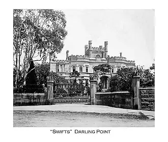 Swifts (also known as The Swifts) is a heritage-listed late-Victorian castellated Gothic Revival mansion located in the suburb of Darling Point, Sydney. Swifts is a rare survivor of a group of similar grand private residences sited on the southern shore of Sydney Harbour. It is described by the Australian Heritage Council as "perhaps the grandest house remaining in Sydney".[2] Swifts was listed on the Register of the National Estate on 21 October 1980,[3] and the New South Wales State Heritage Register on 2 April 1999.[4]