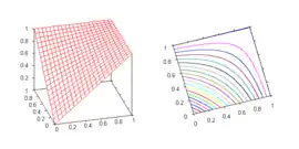 Graph of the nilpotent minimum. The function is discontinuous at the line 0 < x = 1 − y < 1.