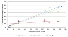 The evolutionary rate of TMCO6 (blue) is compared to a relatively fast evolving fibrinogen protein (green) and cytochrom c (red) that is relatively slow evolving.
