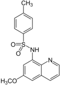 6-Methoxy-(8-p-toluenesulfonamido)quinoline (TSQ) is one of the most efficient fluorescent stains for zinc(II). It was introduced by Soviet biochemists Toroptsev and Eshchenko in the early 1970s. The popularity of TSQ as physiological stain rose after seminal works by Christopher Frederickson two decades later.[1] TSQ forms a 2:1 (ligand-metal) complex with zinc and emits blue light upon excitation at 365 nanometers. TSQ has been extensively applied for determination of extracellular or intracellular levels of Zn2+ in biological systems, also to study Zn2+ in mossy fibers of the hippocampus.