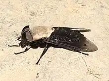 Tabanus punctifer, commonly known as the western horse fly, is a species of horse fly in the family Tabanidae.[2][3] This species of horse fly is approximately 20.5 mm (0.8 in) long.[4] They are typically found throughout the southern and western parts of the United States. They can be found between Utah and Mexico, and between California and Texas.[4] The thorax is covered with long hairs that give it a creamy white color, while the abdomen is completely black.[4] Much like other horse fly species, the Tabanus punctifer female requires a blood meal for the development of their eggs.[5] Females will bite horses, livestock, and humans, making them vectors of disease for pathogens and parasites.[5]