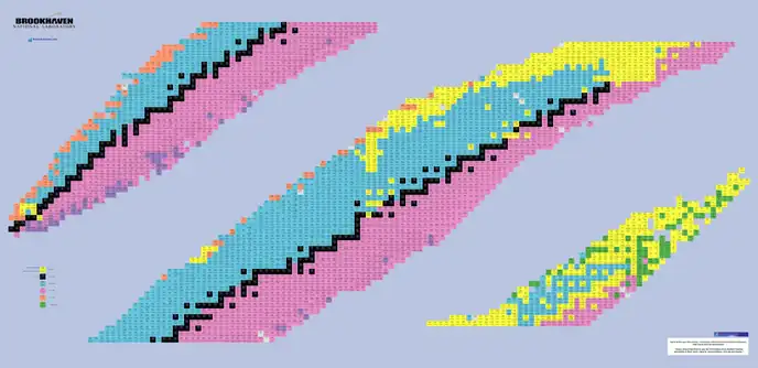 A chart of nuclides. Above, cut into three parts for better presentation; below, combined.