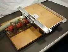 ![]() A cabinet table saw, equipped for cutting large pieces of sheet stock in the direction of the wood's grain (also known as ripping) | |