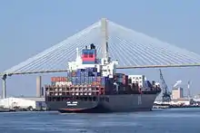 Shipping under the Talmadge Memorial Bridge. Piers (vertical supports) of the original 1953 bridge still stand and can be seen behind the new bridge structure.