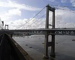 The Tamar Bridge was officially reopened by Princess Anne on 26 April 2002, exactly forty years after the initial opening.[30] Traffic was not expected to increase following the expansion of the bridge, as the Saltash Tunnel further west acts as a buffer for capacity.[29] It was the world's first suspension bridge to be widened using cantilevers, and the world's first suspension bridge to be widened and strengthened while remaining open to traffic. The project won the British Construction Industry Civil Engineering Award for 2002, the Historic Structures category (30 years or older) of the Institution of Civil Engineers Awards 2002, and was one of eight finalists for the Prime Minister's Better Public Building Award 2002.[31]