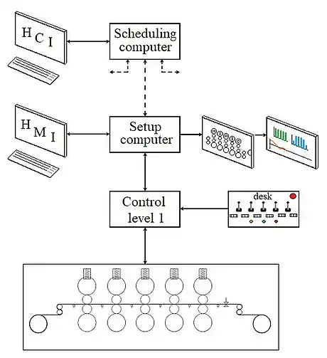 At level 2 is a keyboard and screen having a menu-based interface into the setup computer's mill model. This operator interface is normally described as the Human Machine Interface, HMI. Through this interface the operator trims the setup for the next coil. He/she can trim the individual stand reductions, the inter-stand tensions, and the top speed as required. When the last stand has force control, then the rolling force can also be trimmed.