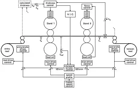 This article describes the characteristics of a mill stand, the properties of a metal (especially steel), and the control of a tandem mill using both equations and diagrams.