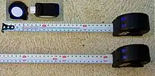 The use of millimeter only tape measures for housing construction is a part of the US metric building code.[16][17] This code does not permit the use of centimeters. Millimeters produce whole (integer) numbers, reduce arithmetic errors, thus decreasing wastage due to such errors. The US made measuring tape shown on the right is interesting in that it is a "Reverse Measuring Tape", where the measurements can be read from right to left just as well as they can be read when the tape is used from left to right.
