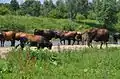Hortobágy National Park in Hungary has the largest herd of Taurus cattle so far, counting 500–600 individuals of which around 200 are mature cows.[7] In addition to crossbred cattle that were imported from Germany, Ankole-Watusi, Hungarian Grey cattle crosses and one half-Holstein Friesian cow are used.[8] There are two sub-herds, a main herd at Pentezug and another one at Karácsonyfok.[9] Studies in the national park showed that cattle are less adapted to dry, cold grassland than Przewalski horses, and until a few years ago the cattle were supplementary fed.[9][10] The winter of 2011 was the first winter in which additional food was not necessary.[11]