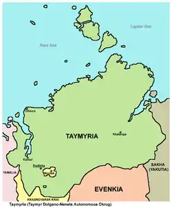 Taymyr Dolgano-Nenets Autonomous Okrug (Russian: Таймы́рский Долга́но-Не́нецкий автоно́мный о́круг, Taymyrsky Dolgano-Nenetsky avtonomny okrug; Enets: Таймыр Оша-Дюрак район, Nenets: Таймыр Долганы-Ненэцие район), was a federal subject of Russia (an autonomous okrug of Krasnoyarsk Krai), the northernmost in Siberian Russia (and thus North Asia). It was named after the Taymyr Peninsula. It was also called Dolgan-Nenets Autonomous Okrug (Долгано-Ненецкий автономный округ), by the name of the indigenous people, Dolgans and Nenets.