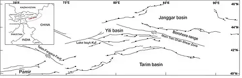 The Yili basin lies south of the Borohoro Range and is bordered by sutures and fault zones in the western Chinese Tian Shan belt.[15] During the Late Paleozoic, the northern boundary of the Yili basin was an active continental margin related to the southward subduction of the North Tianshan oceanic basin; this boundary is represented by Late Carboniferous turbidite and ophiolitic melange.[15] The southern and northern boundaries have been both reworked by Permian strike-slip faults.[15]