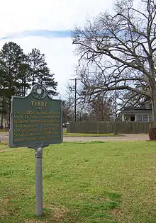 The town of Terry, originally known as Dry Grove, changed its name in honor of W. D. Terry, whose land the town was built on. This information comes from the bronze plaque in the town's center at Utica and Cunningham streets.[3] The area was established in 1811 by settlers from Virginia. In 1867, the town of Terry was established as a depot when the railroad was built through the area.