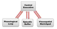 Eysenck et al.[42] elaborate upon the distraction theories and propose the attentional control theory.[43] This theory uses Baddeley's model of working memory to explain the effects of anxiety on working memory and on performance.[44] In Baddeley's theory, working memory (WM) consists of four components, one of them the central executive that has a number of tasks such as coordination of the temporary stores of phonological and visual information (phonological loop and visuospatial sketchpad, respectively).[45]