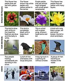 Training a text-to-image model requires a dataset of images paired with text captions. One dataset commonly used for this purpose is COCO (Common Objects in Context). Released by Microsoft in 2014, COCO consists of around 123,000 images depicting a diversity of objects, with five captions per image, generated by human annotators. Oxford-120 Flowers and CUB-200 Birds are smaller datasets of around 10,000 images each, restricted to flowers and birds, respectively. It is considered less difficult to train a high-quality text-to-image model with these datasets, because of their narrow range of subject matter.[7]