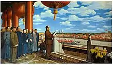 The Founding Ceremony of the Nation (or The Founding of the Nation, Chinese: 开国大典; pinyin: Kāiguó Dàdiǎn) is a 1953 oil painting by Chinese artist Dong Xiwen. It depicts Chairman Mao Zedong and other Communist Party officials proclaiming the People's Republic of China at Tiananmen Square on October 1, 1949. A prominent example of socialist realism, it is one of the most celebrated works of official Chinese art. The painting was repeatedly revised, and a replica painting made to accommodate further changes, as the leaders it depicted fell from power and later were rehabilitated.