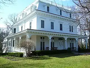 The large white Second French Empire-style mansion, hidden behind tall trees, afforded the writer a multitude of work environments, but he usually wrote at a large dining table.[22] It also allowed him to alternately work on his writings and then on his sketches and watercolours for hours at a time, moving his armchair and paint easel from the library towards the parlor one room at a time in search of sunlight. His meditative view of sunsets at the Bevin House were incorporated in the book, where the prince visits a small planet with 43 daily sunsets, a planet where all that is needed to watch a sunset "is move your chair a few steps."[45][50][Note 6]
