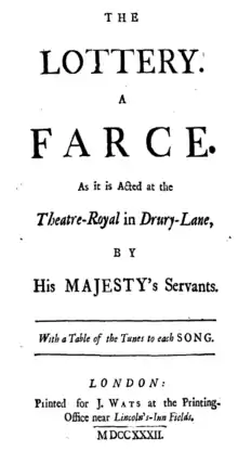 The Lottery is a play by Henry Fielding and was a companion piece to Joseph Addison's Cato. As a ballad opera, it contained 19 songs and was a collaboration with Mr Seedo, a musician. It first ran on 1 January 1732 at the Theatre Royal, Drury Lane. The play tells the story of a man in love with a girl. She claims she has won a lottery, however, making another man pursue her for the fortune and forcing her original suitor to pay off the other for her hand in marriage, though she does not win.