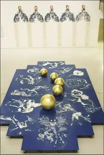 The Oval Court refers to an entire room in the Of Mutability exhibition. On the walls of the room was a venetian glass mirror and photocopied images of the artist crying with tears made of blue foliage which flowed down into computer rendered drawings of the Baroque columns from the baldacchino of St Peter's Basilica, that reach down to the floor. As if formed from the artist's tears, the centre of the room contained an ovoid shaped, photocopied collage of blue toned A4 paper where multiple copies of the artist appear floating in a pool of plenty, with dead animals, insects, flowers, fruit and fish all swimming around her.[4] In the centre of this platform is five golden spheres corresponding to the artists fingers as well as the touch of the divine.[5] In the second room of the exhibition was Carcass (1986) a glass tower that was two metres high, full of rotting vegetable matter which the artist would refill daily. Carcass was adjacent to the room containing The Oval Court, the decay of Carcass seemed to loom over The Oval Court that was full of reminders of the transcience of life.