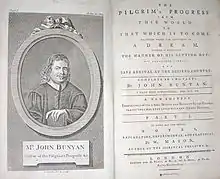 The Pilgrim's Progress from This World, to That Which Is to Come is a 1678 Christian allegory written by John Bunyan. It is regarded as one of the most significant works of theological fiction in English literature and a progenitor of the narrative aspect of Christian media.[1][2][3][4][5][6] It has been translated into more than 200 languages and has never been out of print.[7][8] It appeared in Dutch in 1681, in German in 1703 and in Swedish in 1727. The first North American edition was issued in 1681.[9] It has also been cited as the first novel written in English.[10] According to literary editor Robert McCrum, "there's no book in English, apart from the Bible, to equal Bunyan's masterpiece for the range of its readership, or its influence on writers as diverse as William Hogarth, C. S. Lewis, Nathaniel Hawthorne, Herman Melville, Charles Dickens, Louisa May Alcott, George Bernard Shaw, William Thackeray, Charlotte Bronte, Mark Twain, John Steinbeck and Enid Blyton."[11][12] The words on which the hymn "To be a Pilgrim" is based, come from the novel.