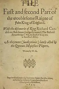 The Troublesome Reign of John, King of England, commonly called The Troublesome Reign of King John (c. 1589) is an Elizabethan history play, probably by George Peele, that is generally accepted by scholars as the source and model that William Shakespeare employed for his own King John (c. 1596).[1][2]