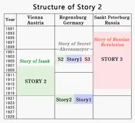 The story consists of four Parts. It encompassed over 30 years, from 1893 to 1924. Through this four parts story, there are three major characters: Julius von Ahrensmeyer, a daughter of the aristocratic house Ahrensmeyer of the Kingdom of Bayern, Aleksei Mihailov (alias Klaus Sommerschmitt), a son of the Marquis House of the Russian Empire, and Isaak Gotthelf Weisheit, a prodigious pianist born in the common people.[13][14][15]