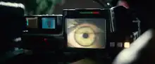 In some scenes, the glow in the pupils of replicants' eyes creates a sense of artificiality. This effect was produced by cinematographer Jordan Cronenweth shining a light along the optical axis of the camera.[8] According to Ridley Scott, "that kickback you saw from the replicants' retinas was a bit of a design flaw. I was also trying to say that the eye is really the most important organ in the human body. It's like a two-way mirror; the eye doesn't only see a lot, the eye gives away a lot. A glowing human retina seemed one way of stating that".[1] Scott considers the glow to be a stylistic device (non-diegetic); only visible to the viewers to help them understand that they are viewing a replicant, almost always occurring after the characters have assumed as much.