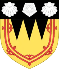 Or three piles Sable within a double-tressure flory counterflory Gules on a chief of the second a rose between two escallops Argent.