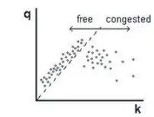 In free traffic flow, empirical data show a positive correlation between the flow rate (in vehicles per unit time) and vehicle density (in vehicles per unit distance). This relationship stops at the maximum free flow with a corresponding critical density . (See Figure 1.)