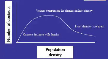 This graph shows the relationship between population density and the transmission of vector-borne disease. Initially, the number of contacts between individuals and vectors increases as population density increases. Eventually, however, the advantage of host density diminishes as the density becomes too great for the vector to maintain its natural ecological relationship with the host, and transmission decreases.