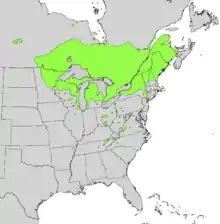 Northern white cedar is native to an area in the southern part of eastern Canada and the adjacent part of the northern United States. It extends from southeastern Manitoba east throughout the Great Lakes region and into Ontario, Québec, New York, Vermont, New Hampshire, Maine, Prince Edward Island, New Brunswick, and Nova Scotia. Isolated populations occur in west-central Manitoba, and to the south in Massachusetts, Connecticut, Ohio, and Illinois and in the Appalachian Mountains of Kentucky, Tennessee, North Carolina, Pennsylvania, Maryland, Virginia, and West Virginia.[4] In Canada, its range reaches the Arctic treeline and the southern tip of Hudson Bay. It grows mainly in places with cooler summers, with a typical temperature of 16 to 22 °C (61 to 72 °F) in July, and a shorter growing season, from 90 to 180 days.[9]