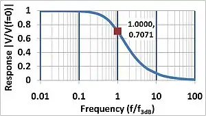 Frequency response of system vs. frequency in units of the bandwidth f3dB. The response is normalized to a zero frequency value of unity, and drops to 1/√2 at the bandwidth.