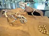 The early 20th century was a fruitful time for ceratopsian research. In 1907, Hatcher and others published a monograph on ceratopsid anatomy that is still considered the single most significant publication on the topic to date.[1] Many new species were being described, including Centrosaurus, Styracosaurus, and Chasmosaurus.[4] Not long after, the Central Asiatic Expedition led by Roy Chapman Andrews of the American Museum of Natural History discovered the primitive ceratopsians Psittacosaurus and Protoceratops in Mongolia. Protoceratops gained notoriety as the supposed parent of the first fossil dinosaur eggs known to science.[5] One of these supposed Protoceratops nests preserved the skeleton of a new kind of theropod dinosaur, Oviraptor. It was thought to have been preserved after being killed in the act of raiding the Protoceratops nest. This narrative would last until the 1990s, when the "Protoceratops" eggs were determined to belong to Oviraptor itself.[6]