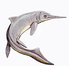 Other notable late 20th century advances in ichthyosaur research include the recognition of a new genus of ichthyosaur called Eurhinosaurus longirostris that had been misclassified as a species of Ichthyosaurus since 1854.[9] In 1986 Christopher McGowan would describe another, similar animal serendipitously discovered in England as Excalibosaurus, after King Arthur's mythical sword.[9] The late 1990s and early 21st century would see scholarly debate regarding the cause of the ichthyosaurs' extinction, especially regarding the potential role played by competition with the mosasaurs which had evolved around the time.[10]