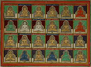 In chronological order, the names, emblems and colours of the 24 tirthankaras of this age are mentioned below:[28][1][29][30]