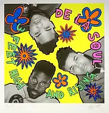 In 2013, Toby Mott exhibited a print edition of the original album art work for De La Soul's 3 Feet High and Rising, displayed alongside memorabilia such as Mott's original sketch, his gold disc, and other items from his private collection.[20] Mott wrote an essay meant to accompany the exhibition in which he described the creation of the 1989 album art.[21] He was commissioned to design the album cover by Tommy Boy Records and invited De La Soul to his New York loft. Atop a stepladder, he took the now-iconic black and white photograph of the three and added the dayglo "daisy-age" art in post-production.[22]