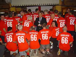 English fans wearing Bəhramov 66 T-shirts. Tofiq Bahramov's son is standing in the middle.