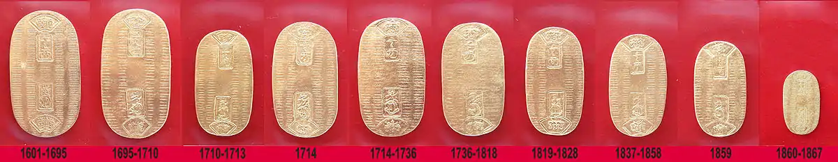 From 1601, Tokugawa coinage was minted in gold, silver, and bronze denominations.[1] The denominations were fixed, but the rates actually fluctuated on the exchange market.[1]