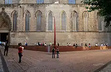 Situated next to the Santa Maria del Mar church, the memorial stands in the center of a square that was used as a mass grave after the fall of Barcelona in the War of the Spanish Succession in 1714. It has a special significance to catalan nationalism as a symbol of those who fought against the Bourbons to retain Catalonia's laws and freedoms. Today, an eternal flame burns atop a metal structure with inscriptions that remember the unknown soldiers who died defending the city and the country. | |