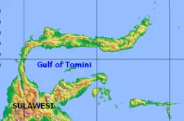 The Gulf of Tomini[1] (Indonesian: Teluk Tomini), also known as the Bay of Tomini, is the equatorial gulf which separates the Minahassa (Northern) and East Peninsulas of the island of Sulawesi (Celebes) in Indonesia. The Togian Islands lie near its center. To the east, the Gulf opens onto the Molucca Sea.
